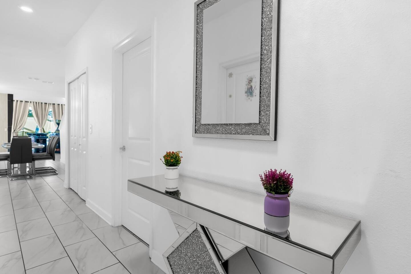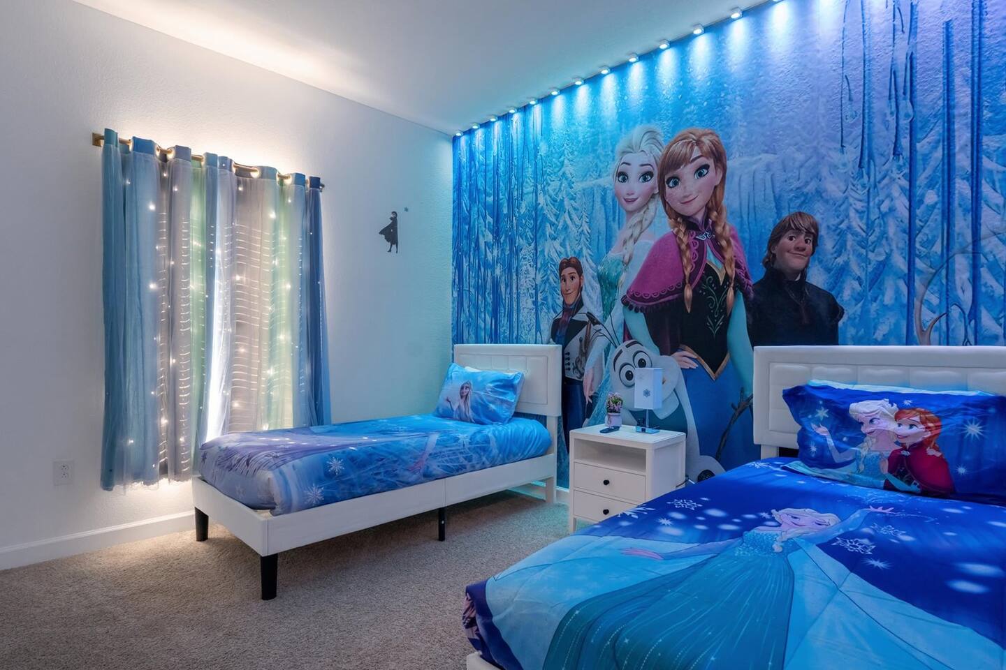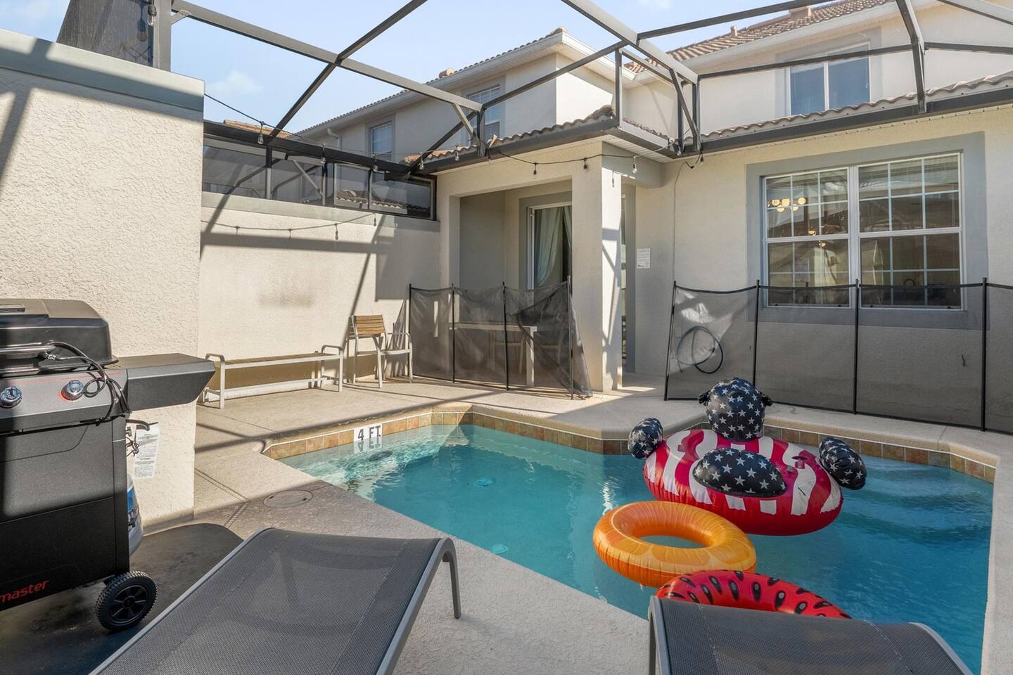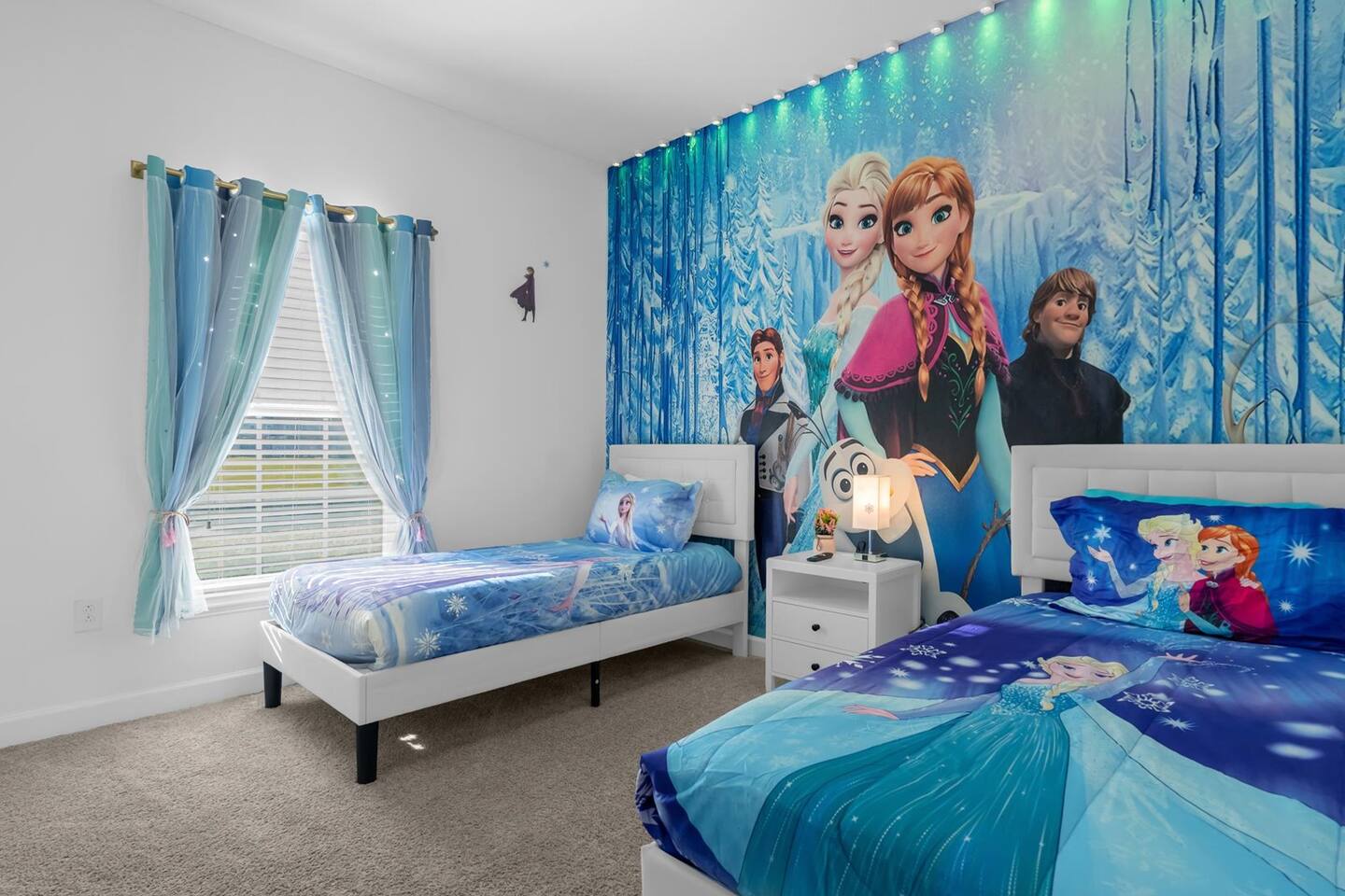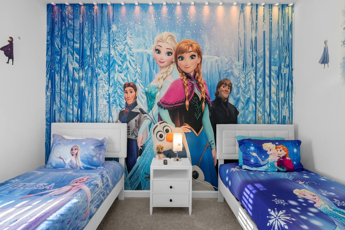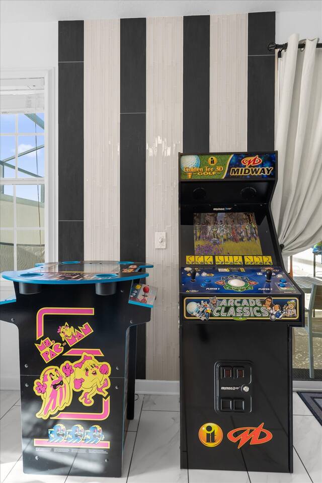 Our luxurious 👍 5 bedrooms 4 full baths accommodates 11 guests. One king beds, and two queen beds, and four twin beds with Frozen and InsideOut Theme. A baby pack n play👶, a high chair, a stroller are available at no additional charge if cleaned and not broken . Save hassle carrying a bulky item for your trip with baby. We inspect them at every checkout so we ensure the condition is in working order. Additional services pool heating🥽 and BBQ 🍖are available upon request at least 48hrs prior to your check-in. **1st Floor A modern open floor concept kitchen, the living room and dining area, you can see private pool from the inside. In the living area, there is a 75” flat screen TV, two arcade game machines, where your whole party can enjoy family time on over sized sectional sofa. On the 1st floor next to entrance door, a bedroom with one queen bed is next to full bath room for those who prefer not to use stairs, and two twin beds with Elsa ❄️themed room! 8 people dining table is ready to enjoy your meals with family. **2nd Floor Second floor has three bedrooms, King, queen, and two twin beds. luxury brand beddings to sleep comfortably. Also has three full bathrooms with all soaps, and shampoos, conditioners, and hair dryers. Full size washer and dryer with complementary detergent and softeners available for you and your family.