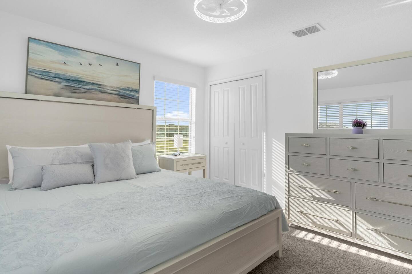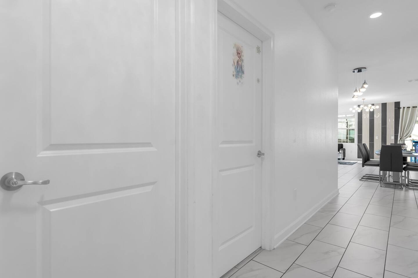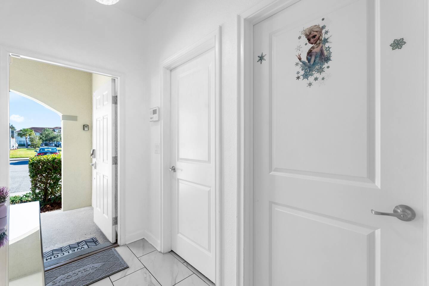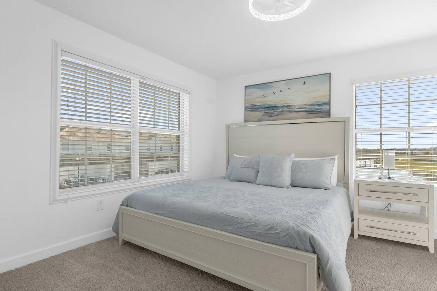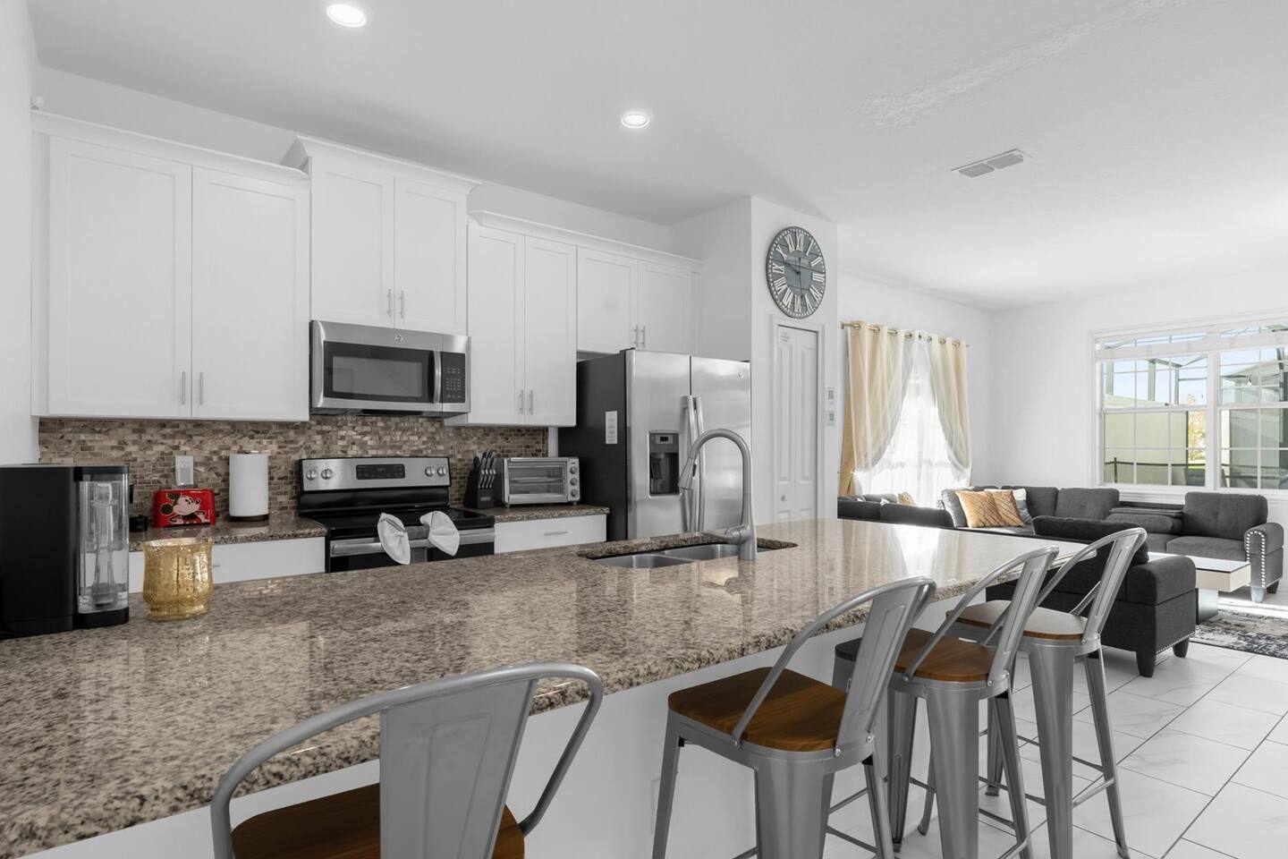 Our luxurious 👍 5 bedrooms 4 full baths accommodates 11 guests. One king beds, and two queen beds, and four twin beds with Frozen and InsideOut Theme. A baby pack n play👶, a high chair, a stroller are available at no additional charge if cleaned and not broken . Save hassle carrying a bulky item for your trip with baby. We inspect them at every checkout so we ensure the condition is in working order. Additional services pool heating🥽 and BBQ 🍖are available upon request at least 48hrs prior to your check-in. **1st Floor A modern open floor concept kitchen, the living room and dining area, you can see private pool from the inside. In the living area, there is a 75” flat screen TV, two arcade game machines, where your whole party can enjoy family time on over sized sectional sofa. On the 1st floor next to entrance door, a bedroom with one queen bed is next to full bath room for those who prefer not to use stairs, and two twin beds with Elsa ❄️themed room! 8 people dining table is ready to enjoy your meals with family. **2nd Floor Second floor has three bedrooms, King, queen, and two twin beds. luxury brand beddings to sleep comfortably. Also has three full bathrooms with all soaps, and shampoos, conditioners, and hair dryers. Full size washer and dryer with complementary detergent and softeners available for you and your family.