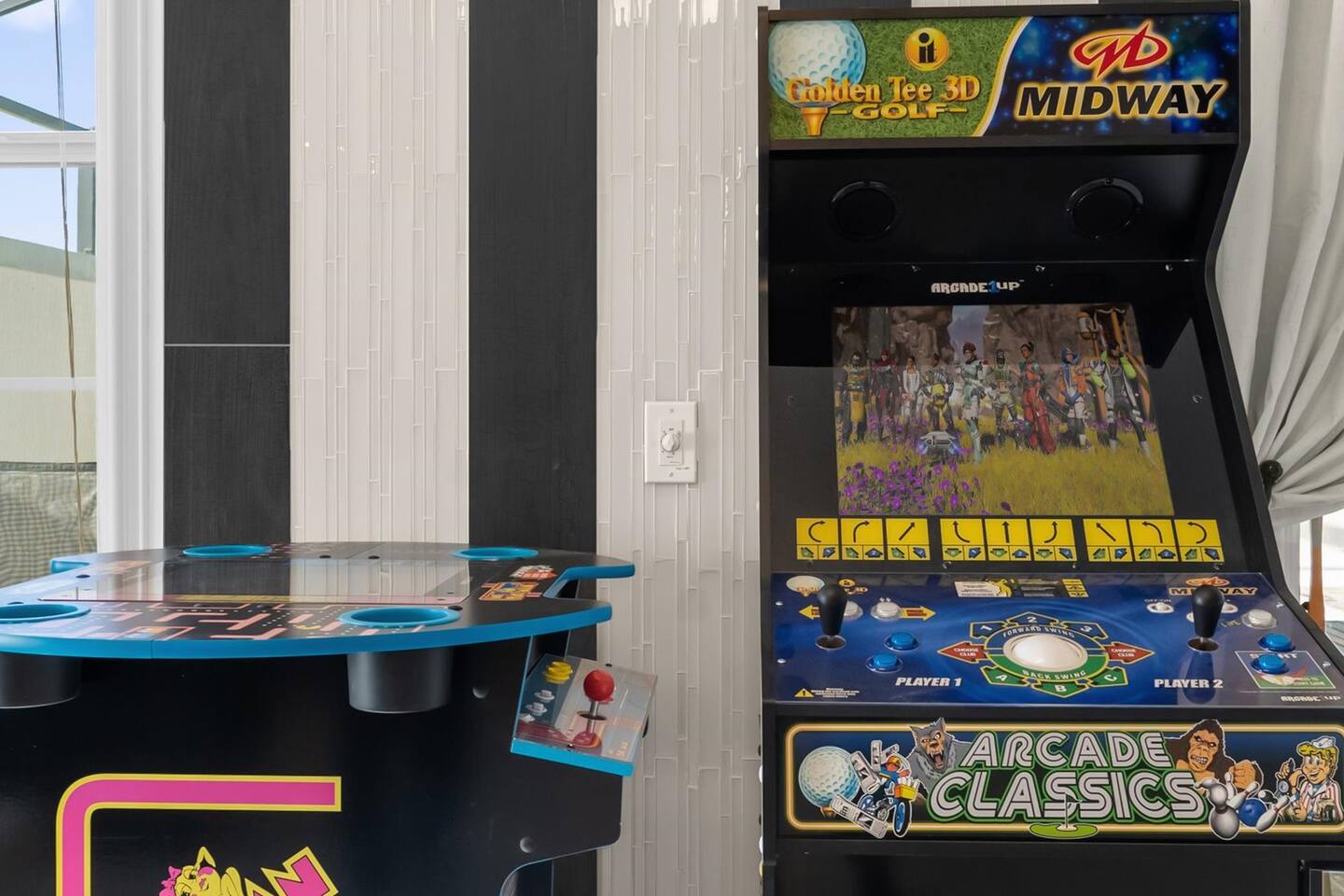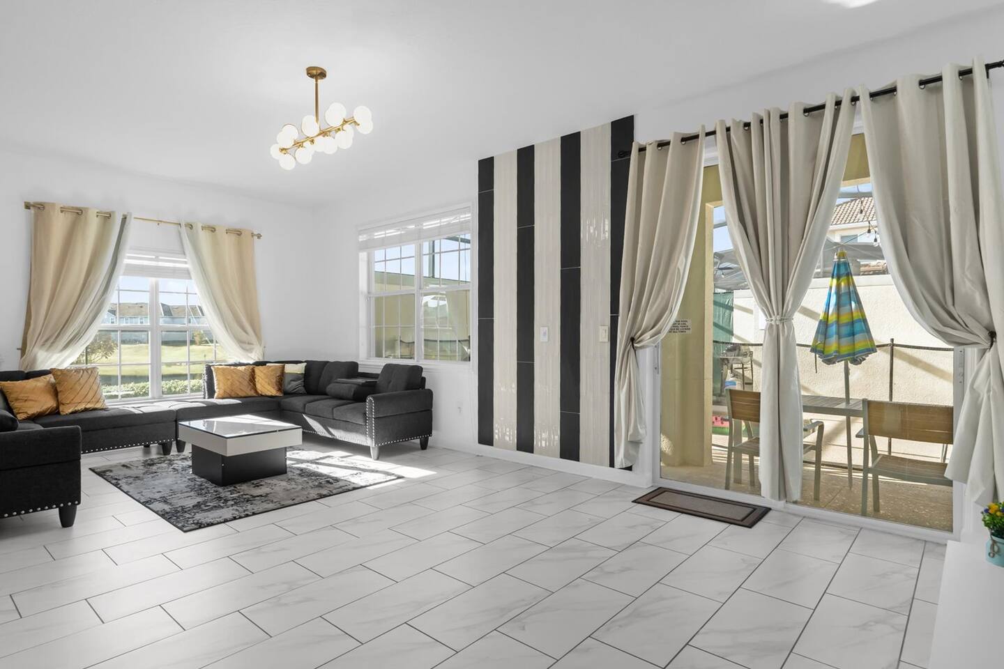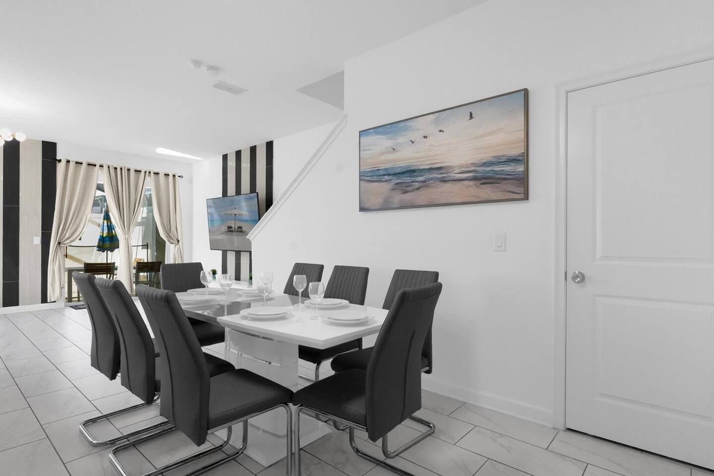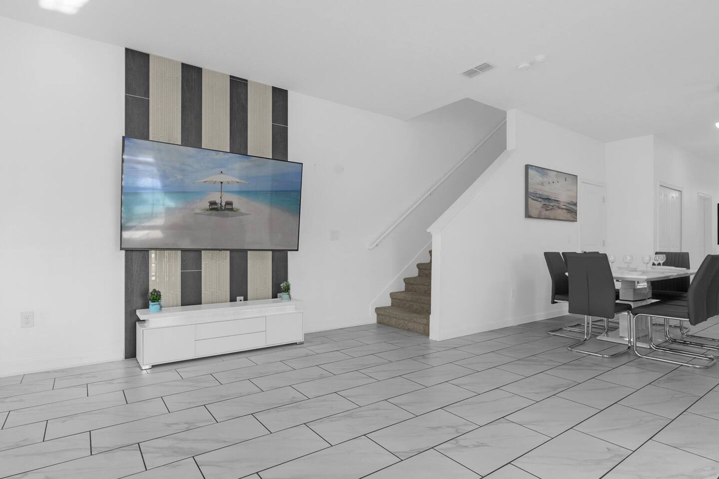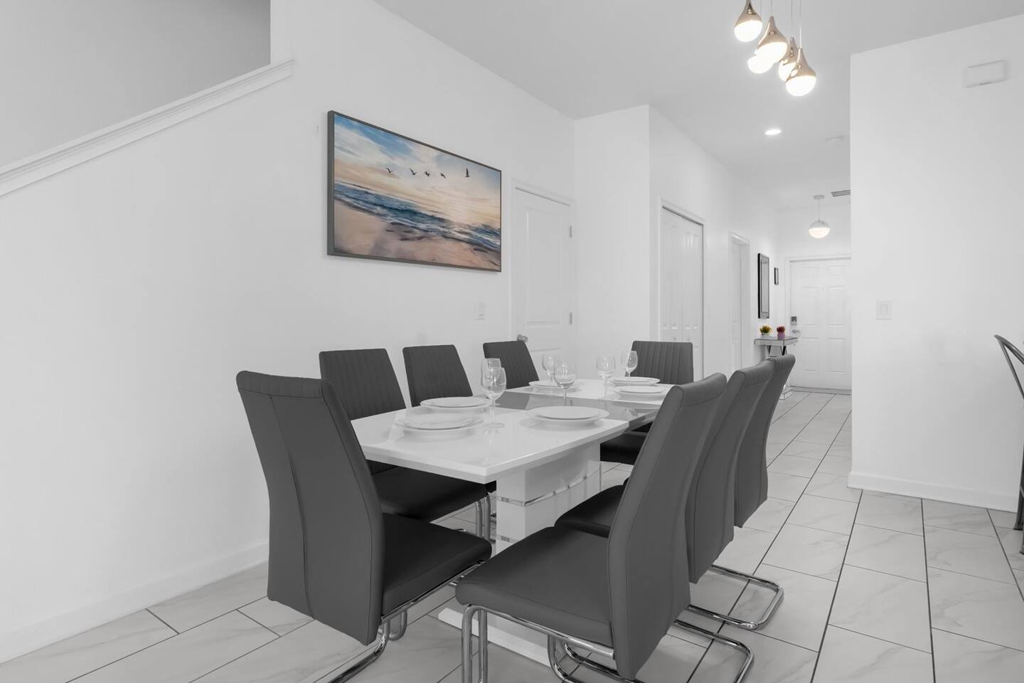 Our luxurious 👍 5 bedrooms 4 full baths accommodates 11 guests. One king beds, and two queen beds, and four twin beds with Frozen and InsideOut Theme. A baby pack n play👶, a high chair, a stroller are available at no additional charge if cleaned and not broken . Save hassle carrying a bulky item for your trip with baby. We inspect them at every checkout so we ensure the condition is in working order. Additional services pool heating🥽 and BBQ 🍖are available upon request at least 48hrs prior to your check-in. **1st Floor A modern open floor concept kitchen, the living room and dining area, you can see private pool from the inside. In the living area, there is a 75” flat screen TV, two arcade game machines, where your whole party can enjoy family time on over sized sectional sofa. On the 1st floor next to entrance door, a bedroom with one queen bed is next to full bath room for those who prefer not to use stairs, and two twin beds with Elsa ❄️themed room! 8 people dining table is ready to enjoy your meals with family. **2nd Floor Second floor has three bedrooms, King, queen, and two twin beds. luxury brand beddings to sleep comfortably. Also has three full bathrooms with all soaps, and shampoos, conditioners, and hair dryers. Full size washer and dryer with complementary detergent and softeners available for you and your family.
